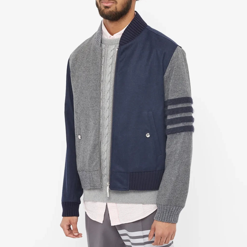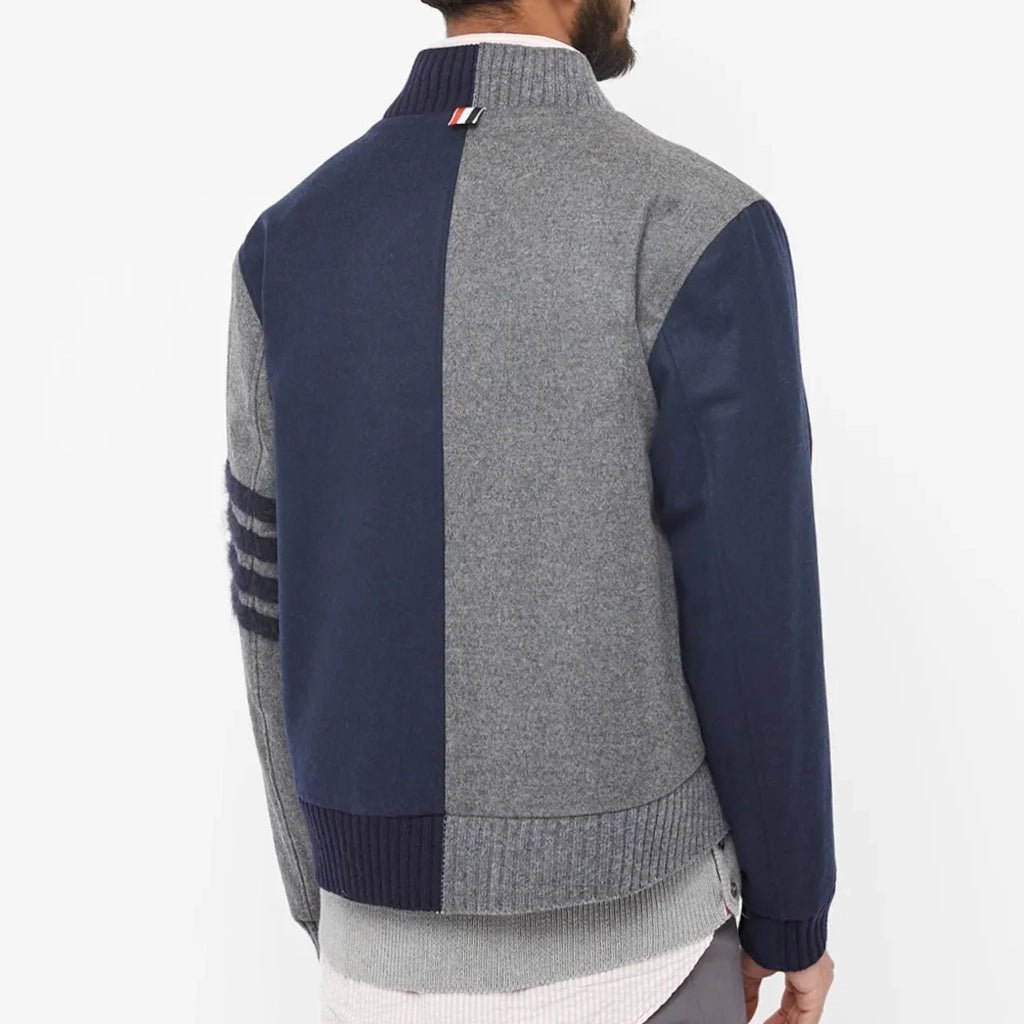 Renowned for its modern preppy style Thom Browne puts a collegiate-inspired twist on this ready-to-wear jacket. Crafted from luxe wool, it’s styled in shades of navy and grey and is complete with the label’s signature 4-Bar stripes at the arm. Meanwhile, a full zip closure and snug ribbed trims make it perfect for those chiller days.